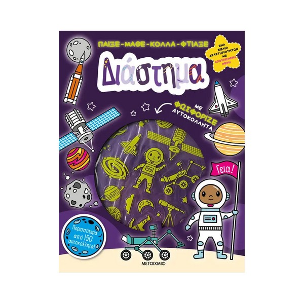 Ένα υπέροχο βιβλίο που περιλαμβάνει: Ένα σωρό συναρπαστικές πληροφορίες για το Διάστημα, ασκήσεις και δραστηριότητες, 150 πολύχρωμα και 30 φωσφοριζέ αυτοκόλλητα, καθώς και 16 σελίδες με αποσπώμενα μέρη για να φτιάξεις ένα επιτραπέζιο παιχνίδι με κάρτες και όμορφες κατασκευές.