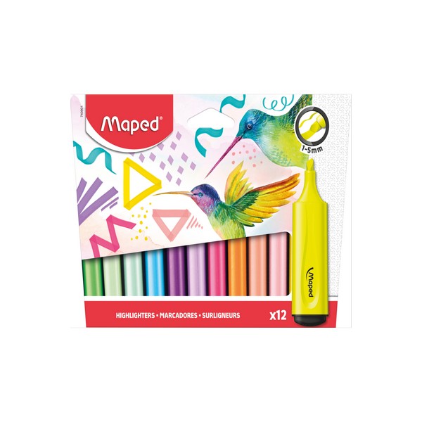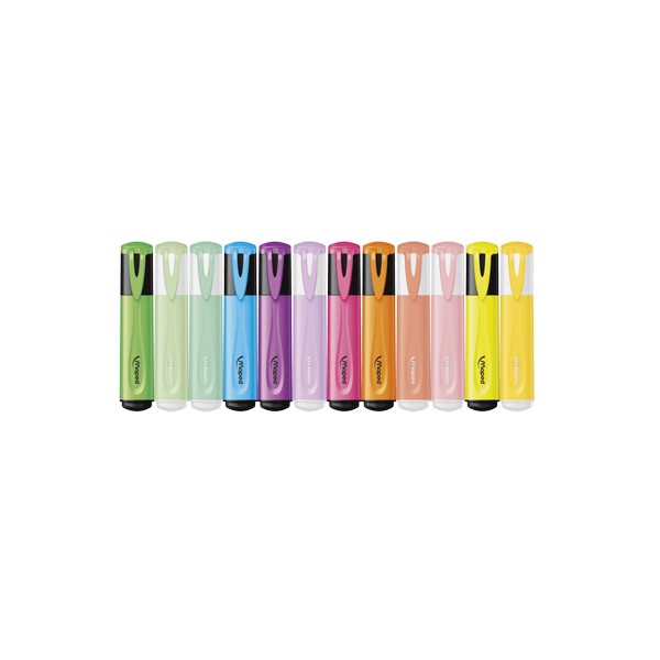 Το σετ υπογραμμιστών της Maped περιλαμβάνει όλα τα fluo και τα παστέλ χρώματα. Κωνική μύτη που μπορεί να υπογραμμίσει από 1-5mm ανάλογα με τον τρόπο που το χρησιμοποιείτε. Εργονομικός σχεδιασμός. Η συσκευασία αποτελείται από ανακυκλωμένο χαρτόνι.